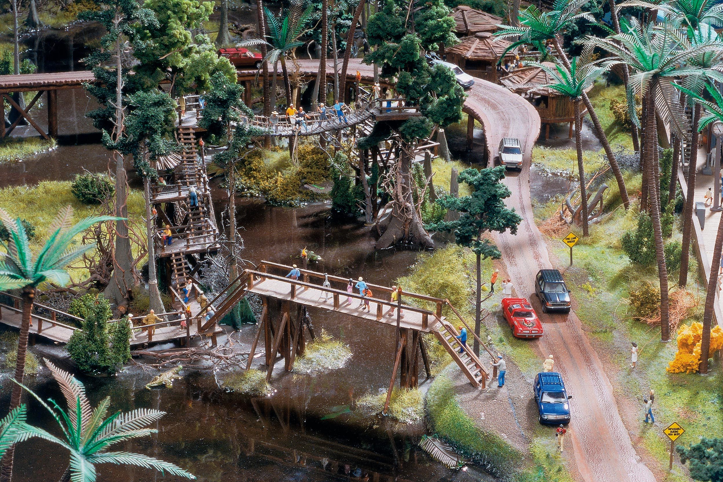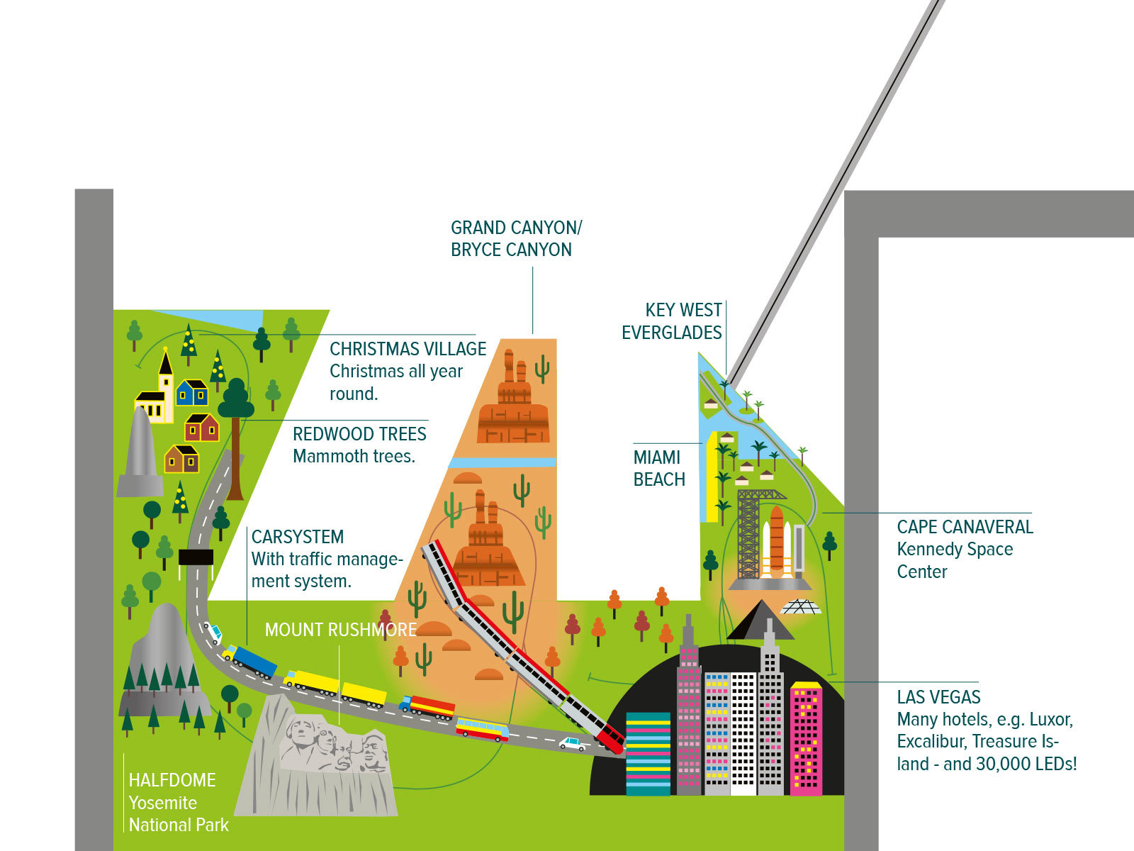 The USA theme world was constructed from 01/2003 - 12/2003. Altogether it took 99,000 hours to build all the little details and the special landscapes. It was a real challenge to compile the many facets of the USA on 100 m².