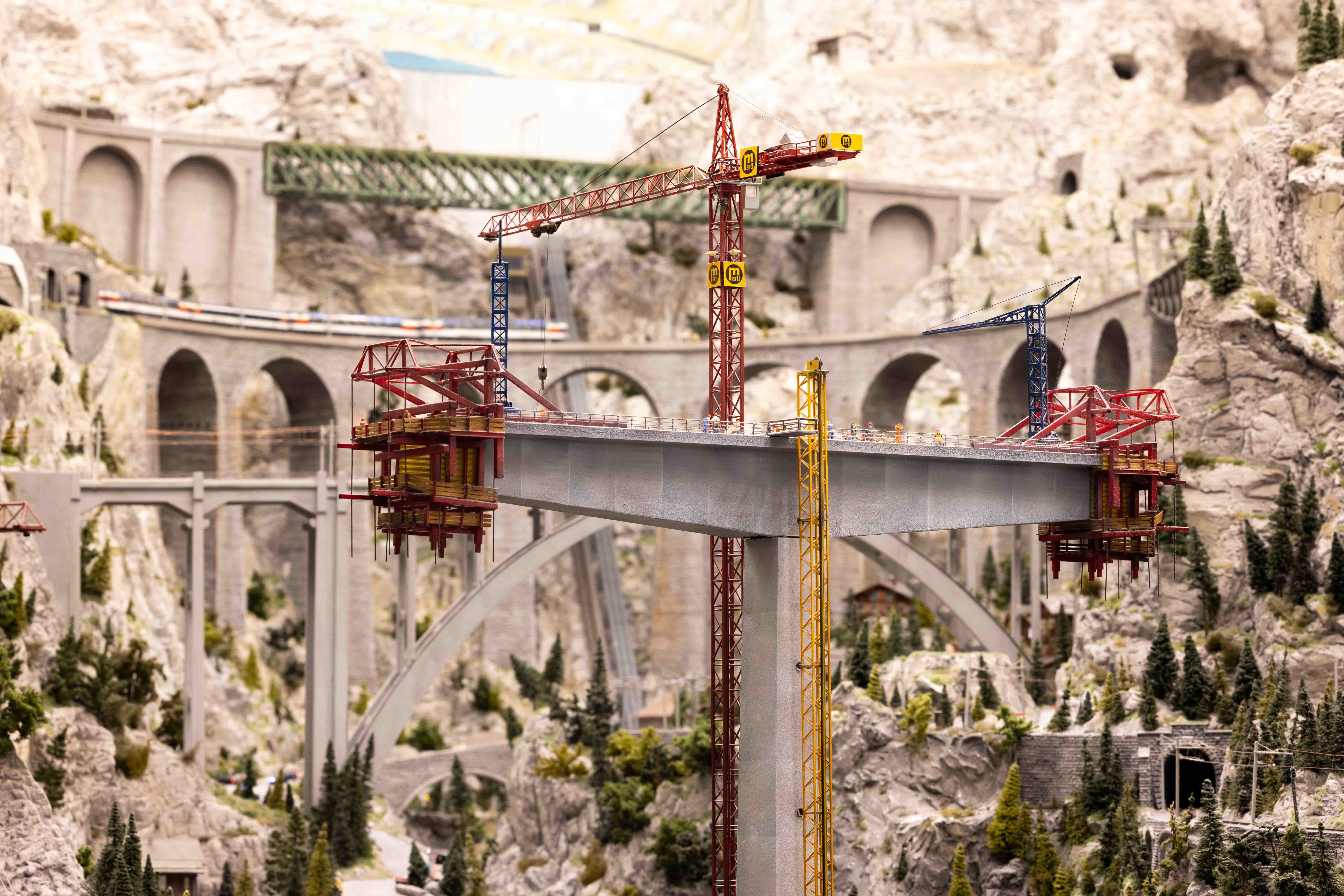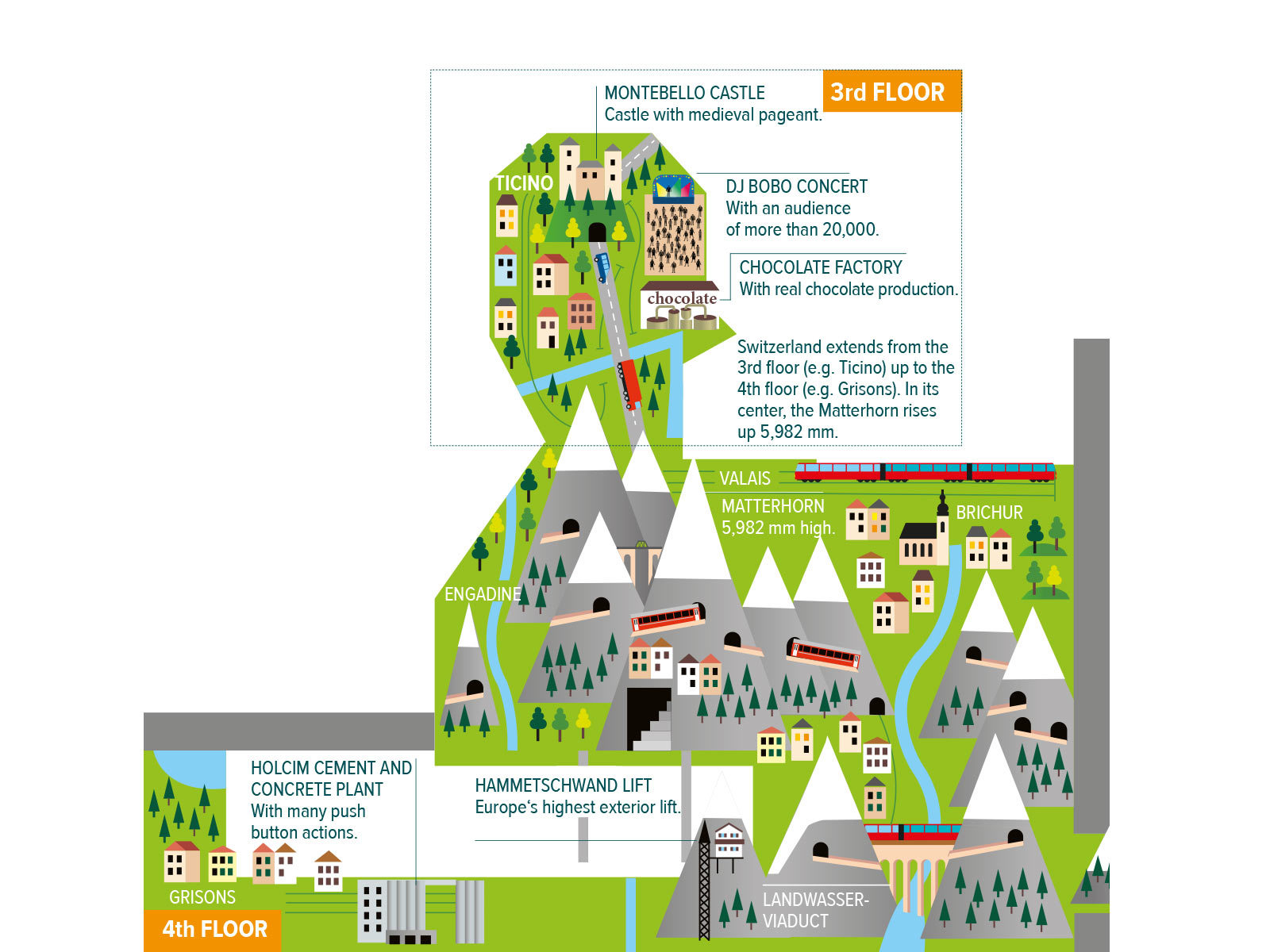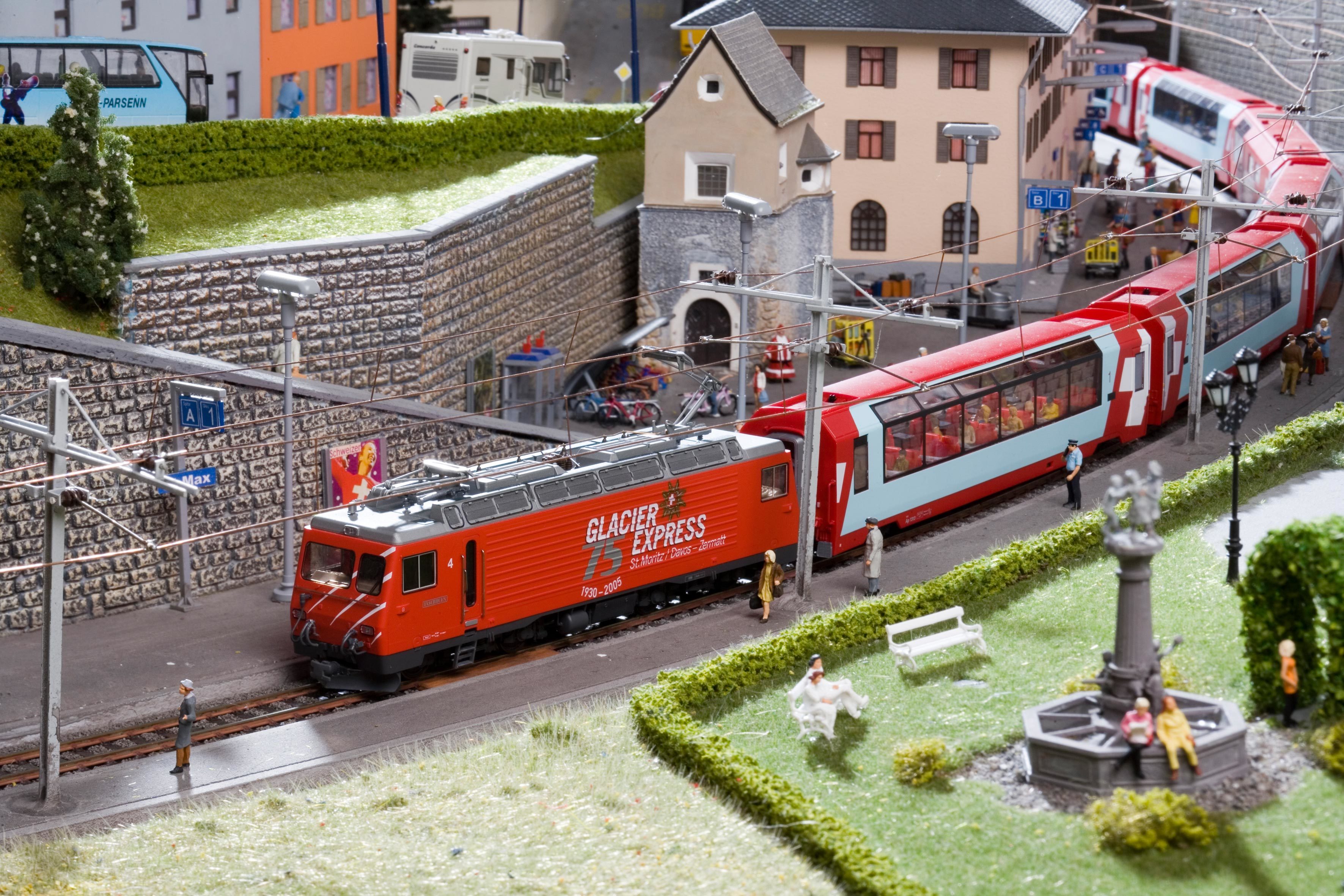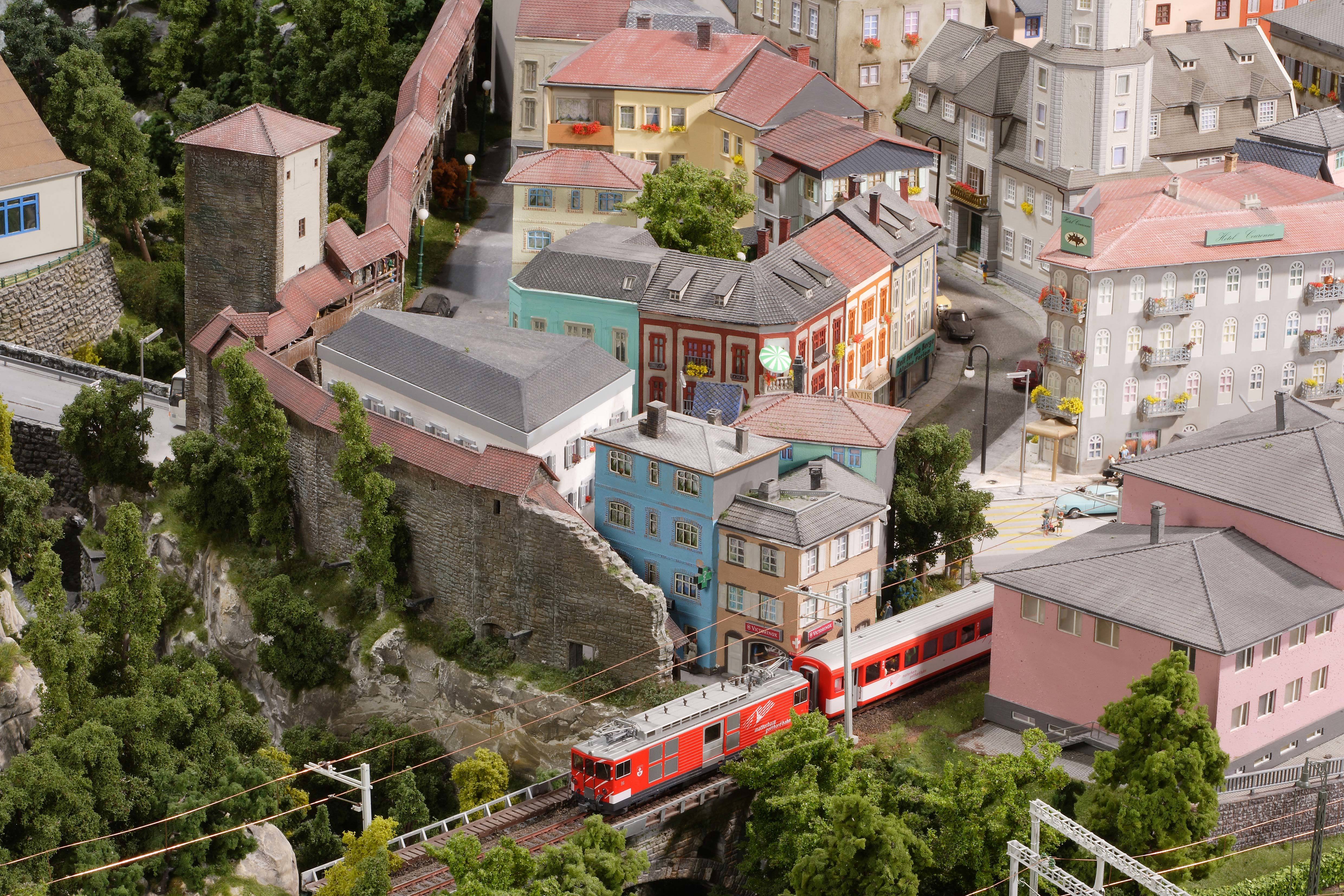 Mini-Switzerland at the Wunderland consists of three cantons, with typical buildings and landscape. On the fourth floor, at about 4,500 mm height, lies Graubünden with many typical landmarks and highlights of the region. For example there is St. Max (better known as St. Moritz).