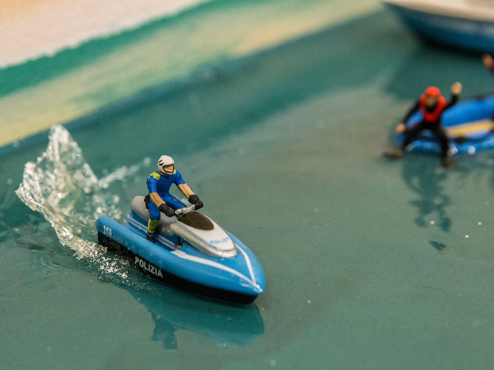 In addition, there is of course the famous St. Mark's Square with its surrounding ensemble of buildings, the Rialto Bridge, the Procuratie and many famous palazzi to see. Apart from the well-known tourist magnets, the winding alleys and small courtyards in particular offer plenty of space for the real Venetian life and culture of the Northern Italians. For the order in these alleys a quite well-known commissar takes care. Not only pickpockets therefore have to dig deep into their bag of tricks - our technicians have also trained themselves in this: The section is equipped with numerous push-button actions that make visitors at the edge of the layout marvel and smile.