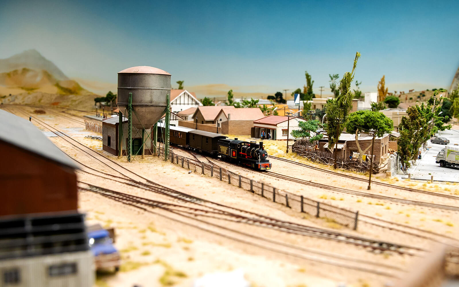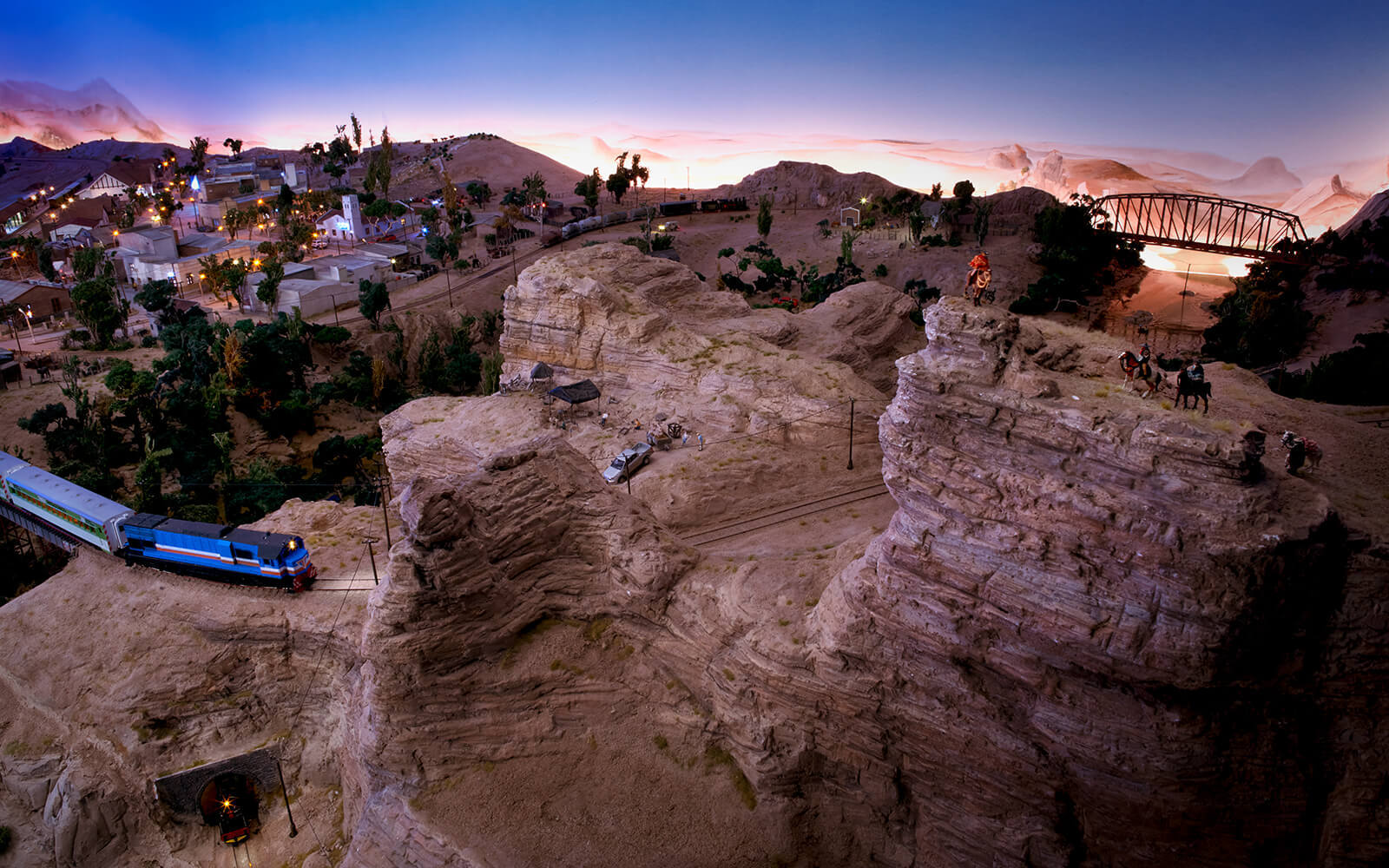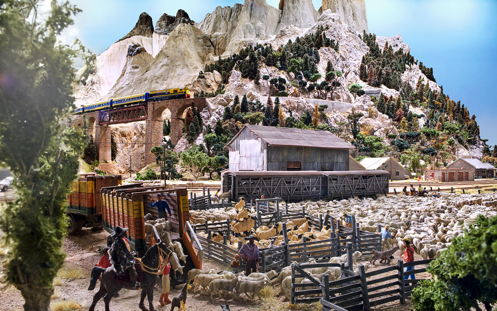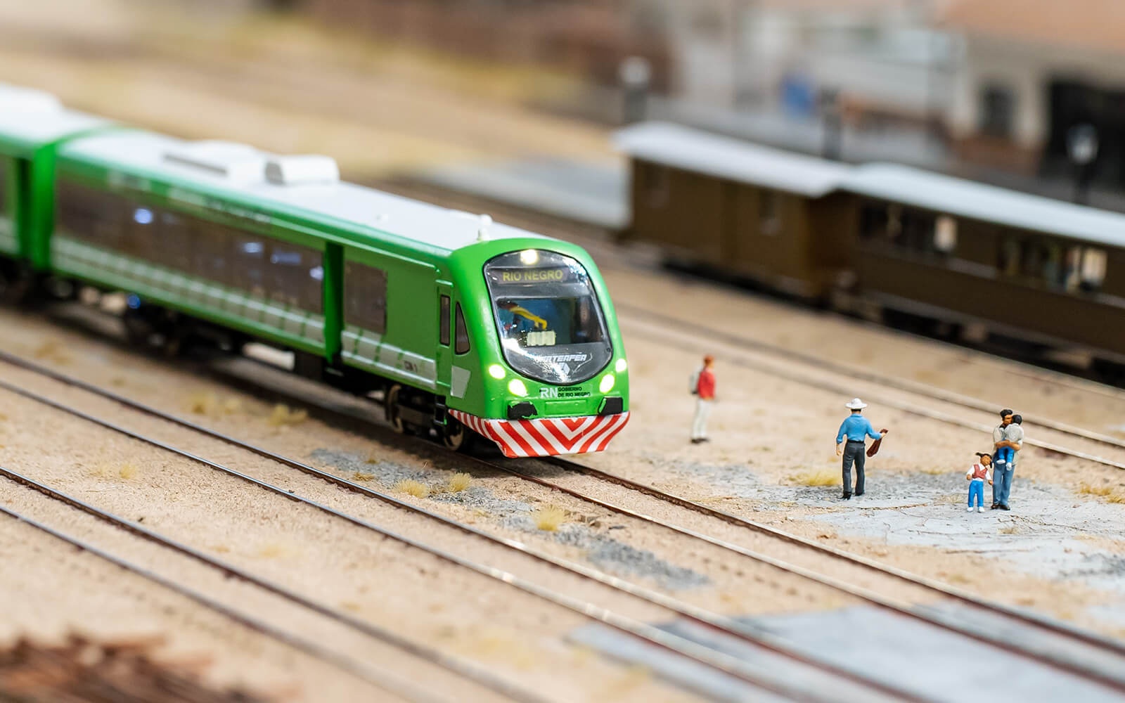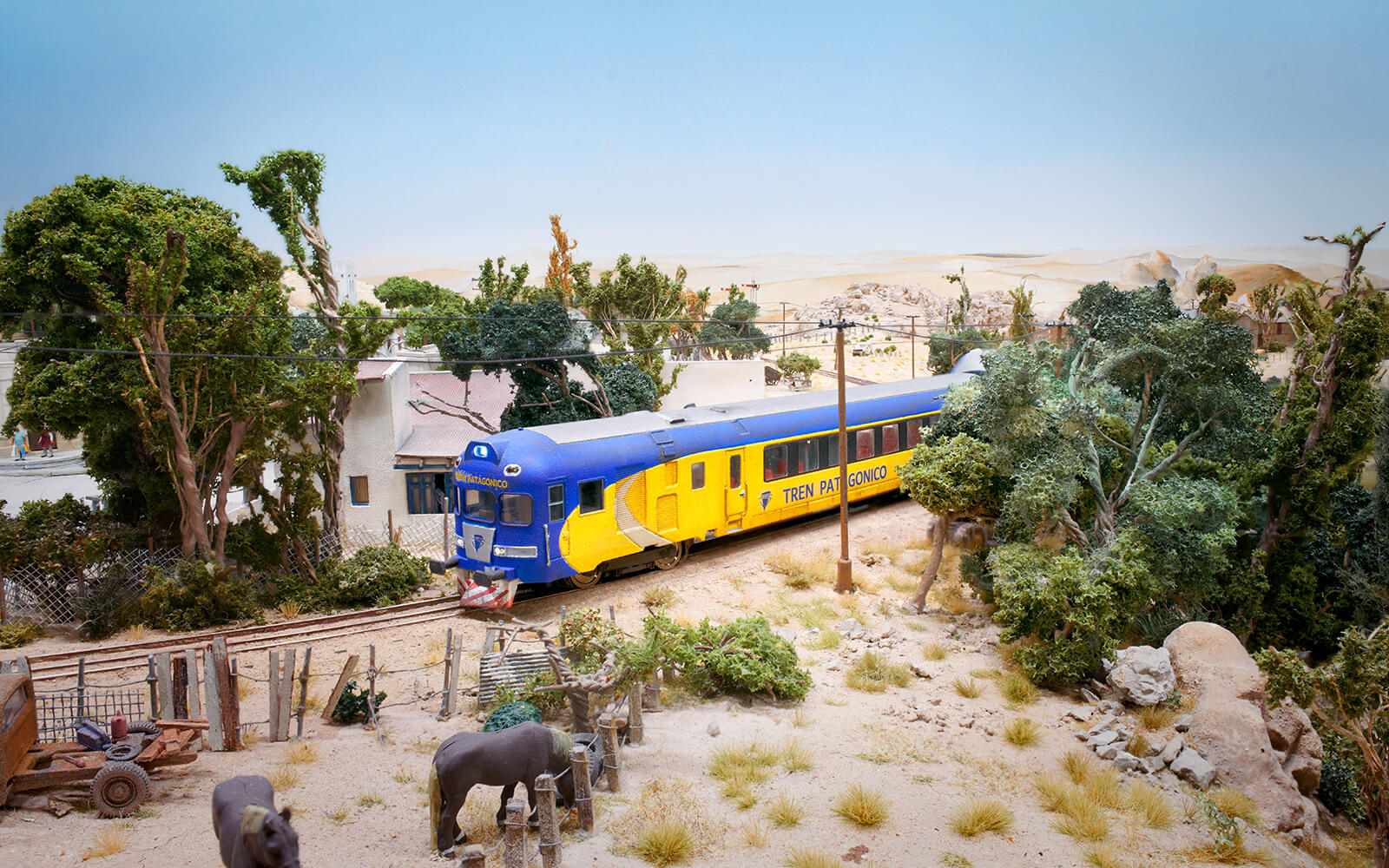 When building Patagonia, some rethinking had to be done, as the narrow-gauge railway La Trochita ("The Little Train") runs there. In the original, the tracks have a track gauge of 750 mm, which corresponds to only 9 mm in 1:87 scale (H0e gauge). All locomotives and wagons for had to be built and painted by hand. The small town of Ingeniero Jacobacci in the Argentine province is the only densely populated settlement in the Patagonia of Wunderland. Despite its modest size, there is a lively community here and you can discover many little stories. From dinosaur excavations to a spaceship crash and many guachos on their own missions, there is a lot to discover.