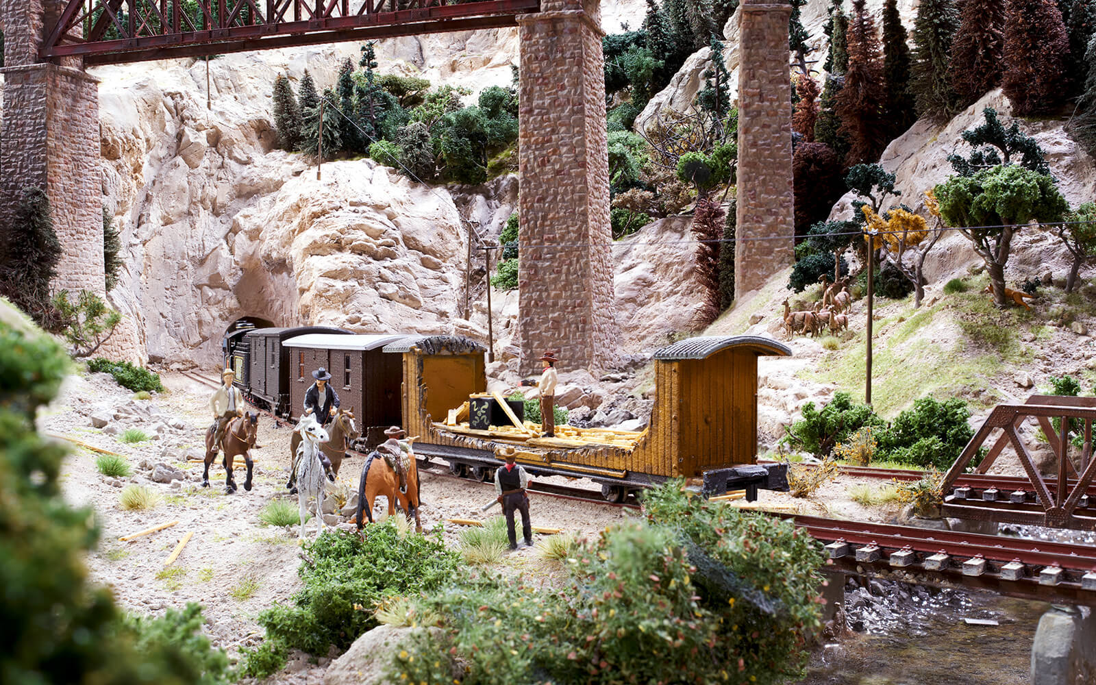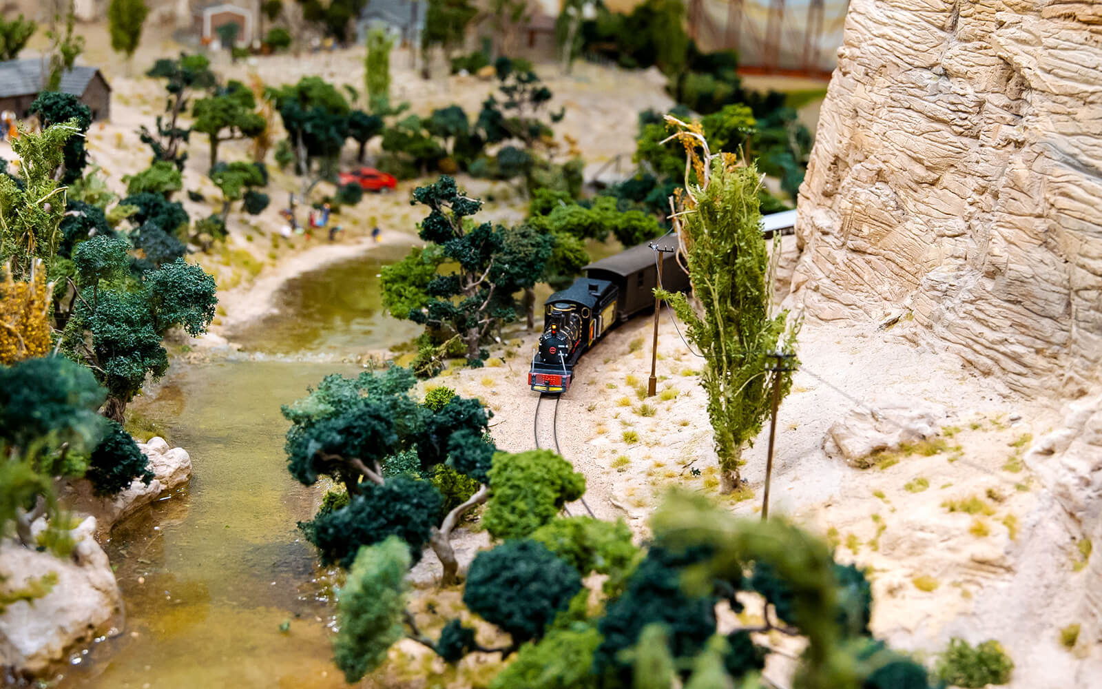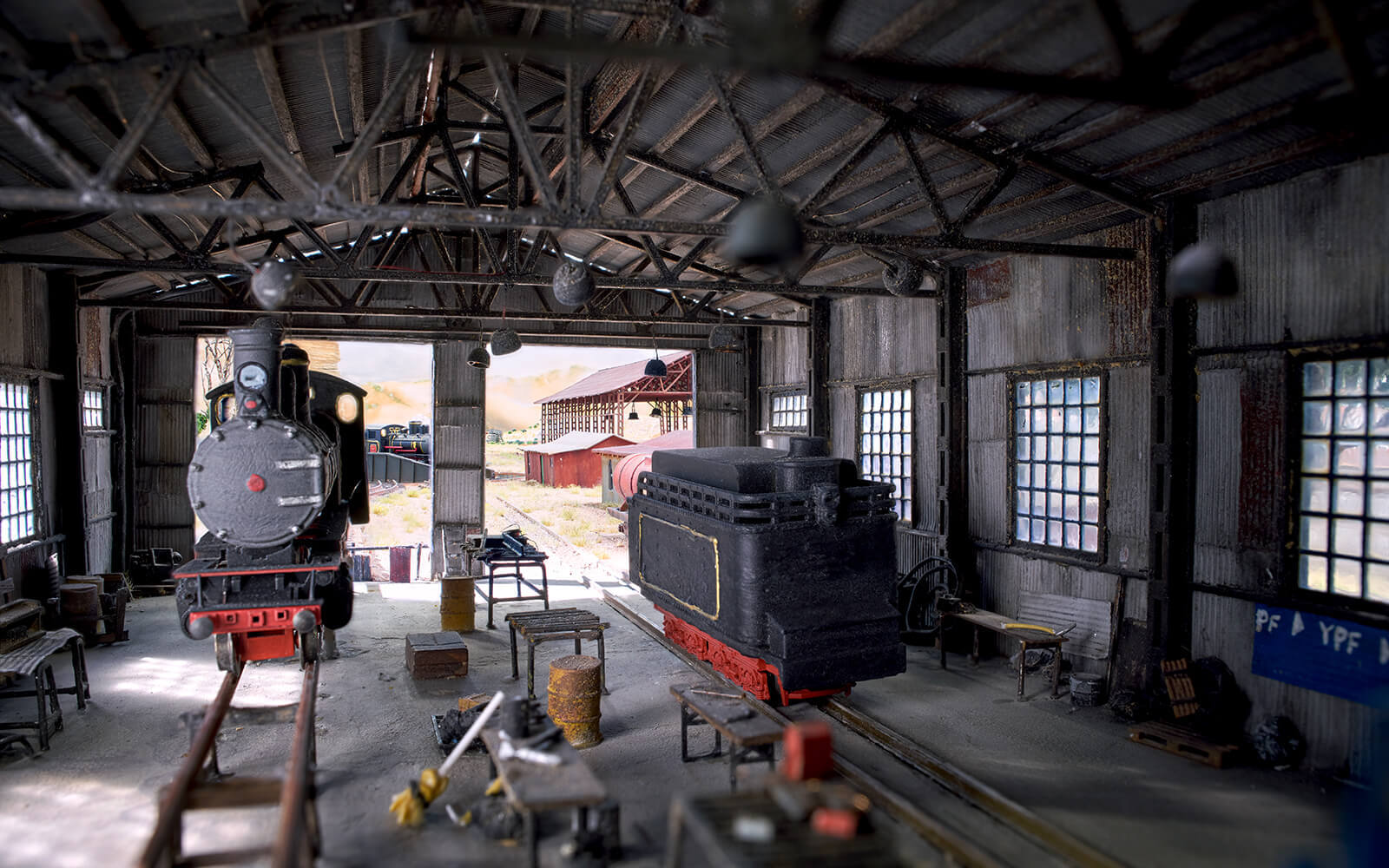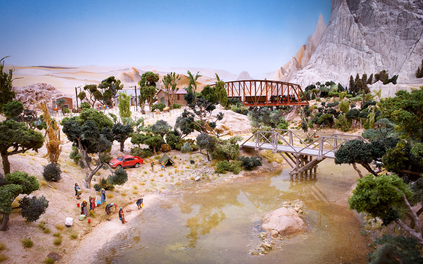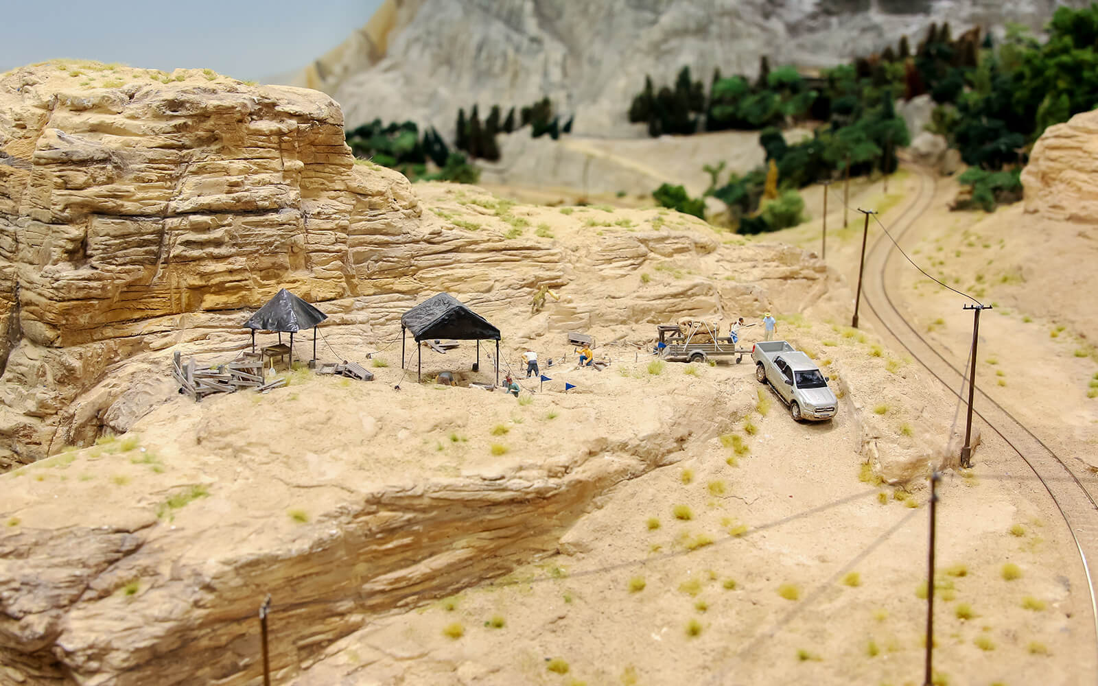 When building Patagonia, some rethinking had to be done, as the narrow-gauge railway La Trochita ("The Little Train") runs there. In the original, the tracks have a track gauge of 750 mm, which corresponds to only 9 mm in 1:87 scale (H0e gauge). All locomotives and wagons for had to be built and painted by hand. The small town of Ingeniero Jacobacci in the Argentine province is the only densely populated settlement in the Patagonia of Wunderland. Despite its modest size, there is a lively community here and you can discover many little stories. From dinosaur excavations to a spaceship crash and many guachos on their own missions, there is a lot to discover.