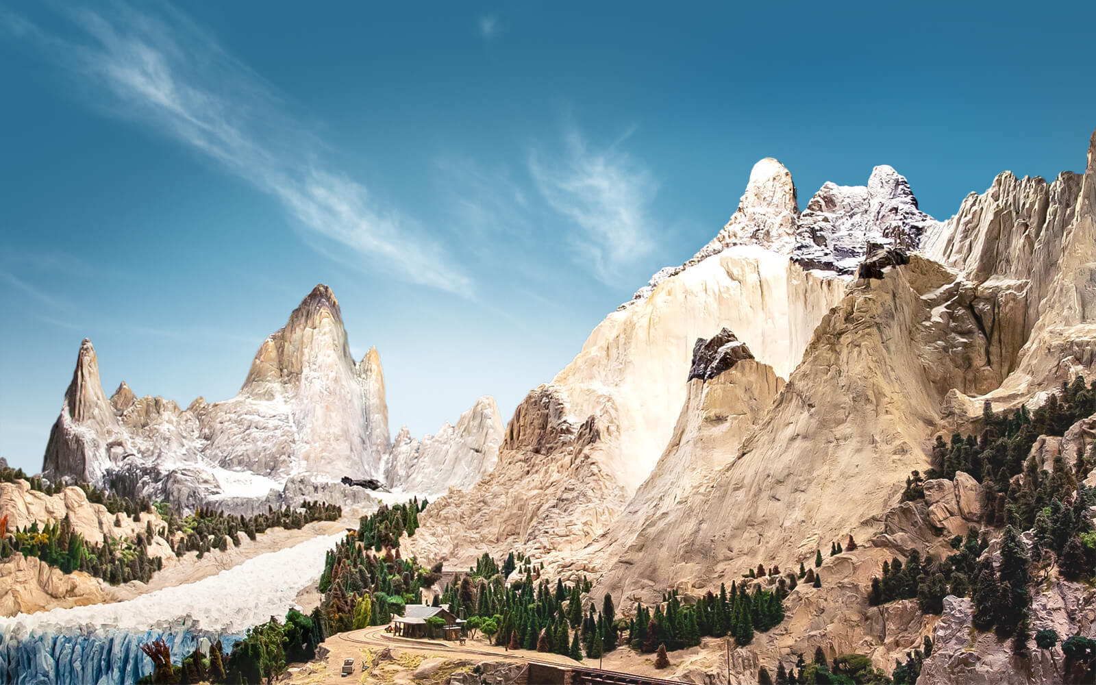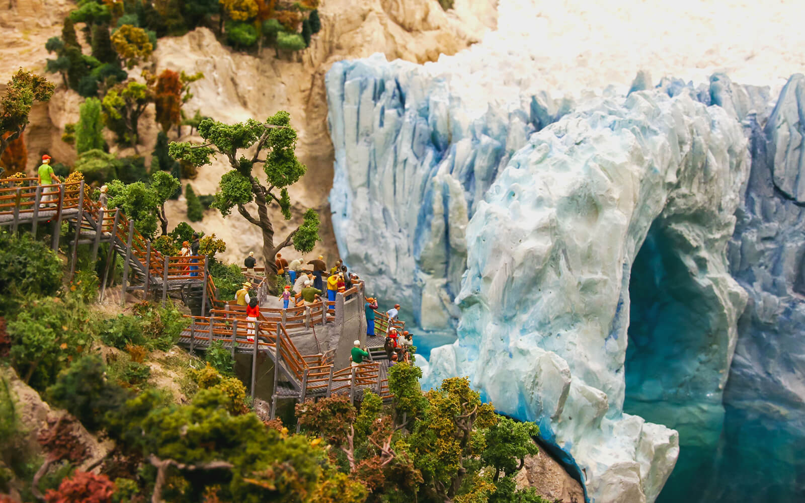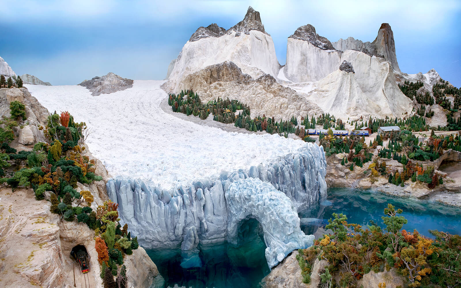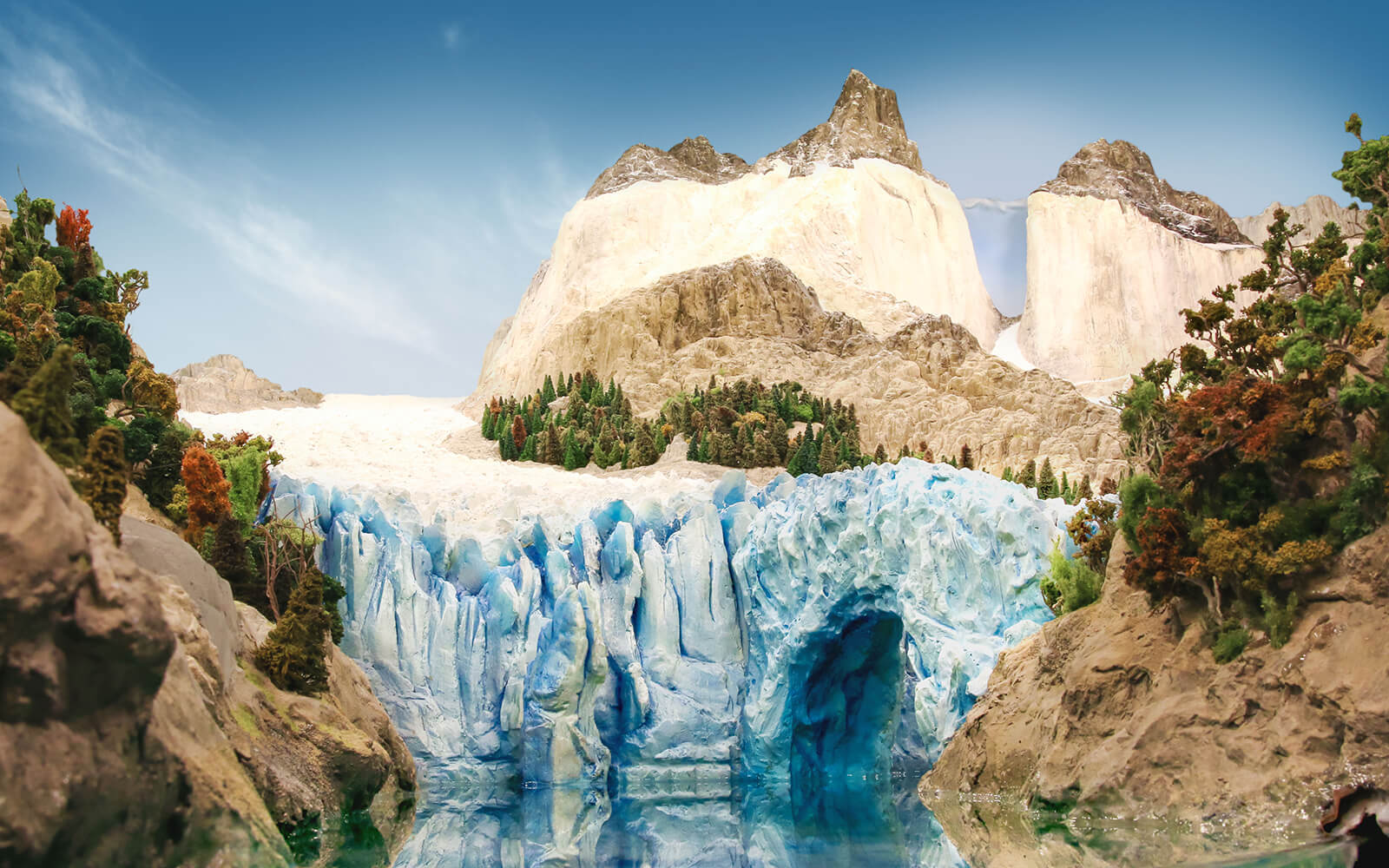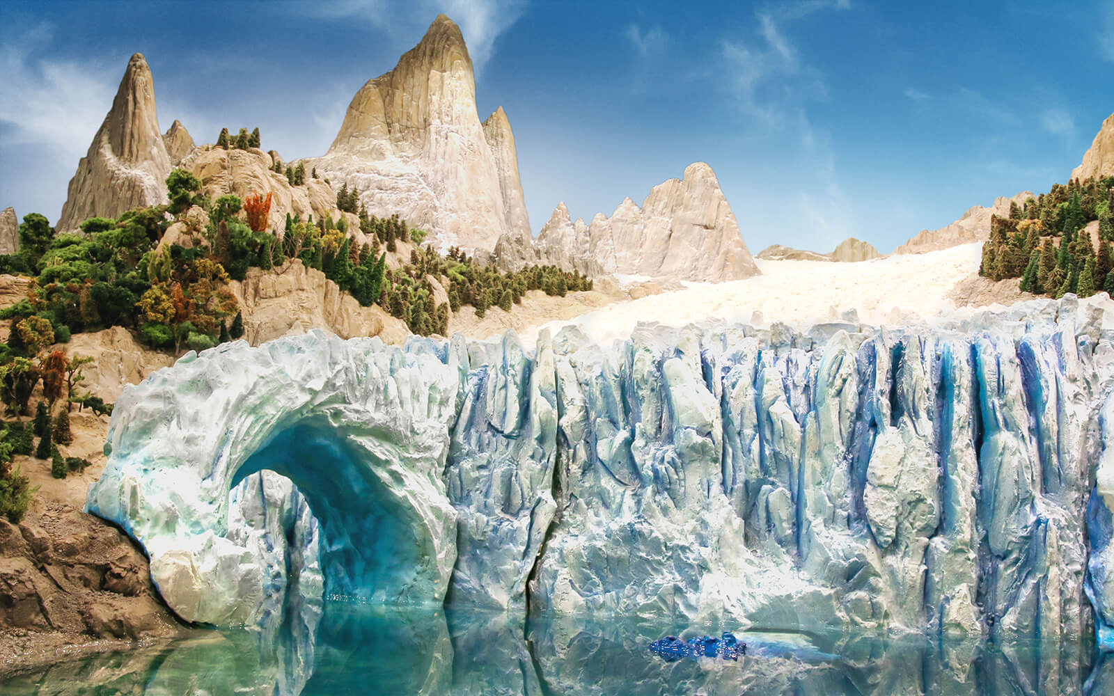 In the background, the famous Fitz Roy rises into the sky, while in the foreground large ice blocks of the Perito Moreno glacier fall into the water. The glacier has been recreated as accurate as possible in Wunderland and stands out with its blue colour. A mechanism lets the ice blocks fall into the water every few minutes.