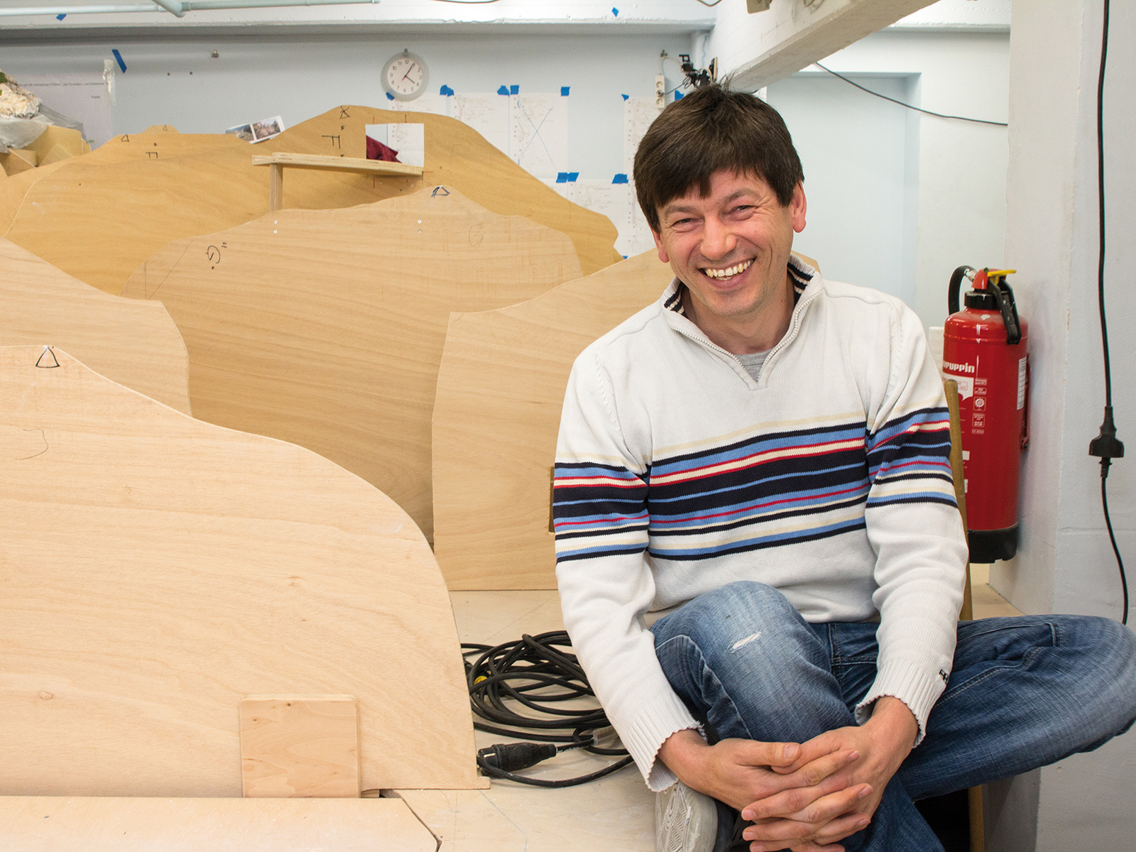 Many meticulous hours of research with pictures and geological map material are needed to model a palette of steel, wood, and plaster into a mountain that looks like the real deal.