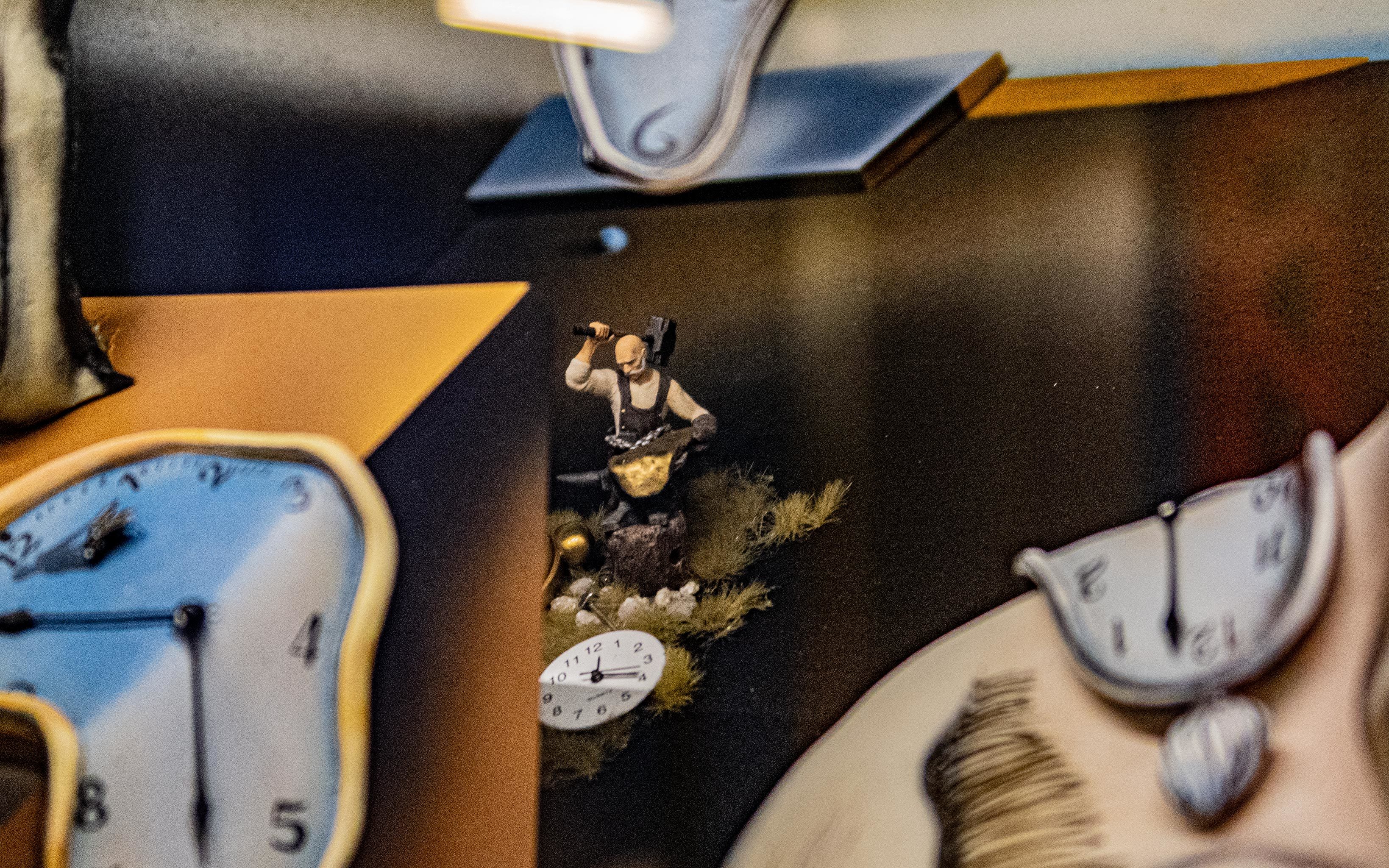 A brief look behind the scenes shows a blacksmith at work. Whether he is the cause of the scenery or wants to straighten the clocks again is left to everyone's interpretation.