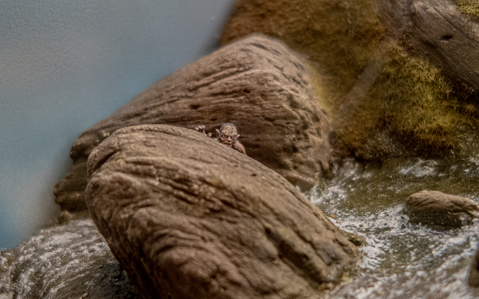 At the river, a familiar figure from Lord of the Rings is hiding. He waits near the fisherman. Perhaps to steal a fish at the right moment.