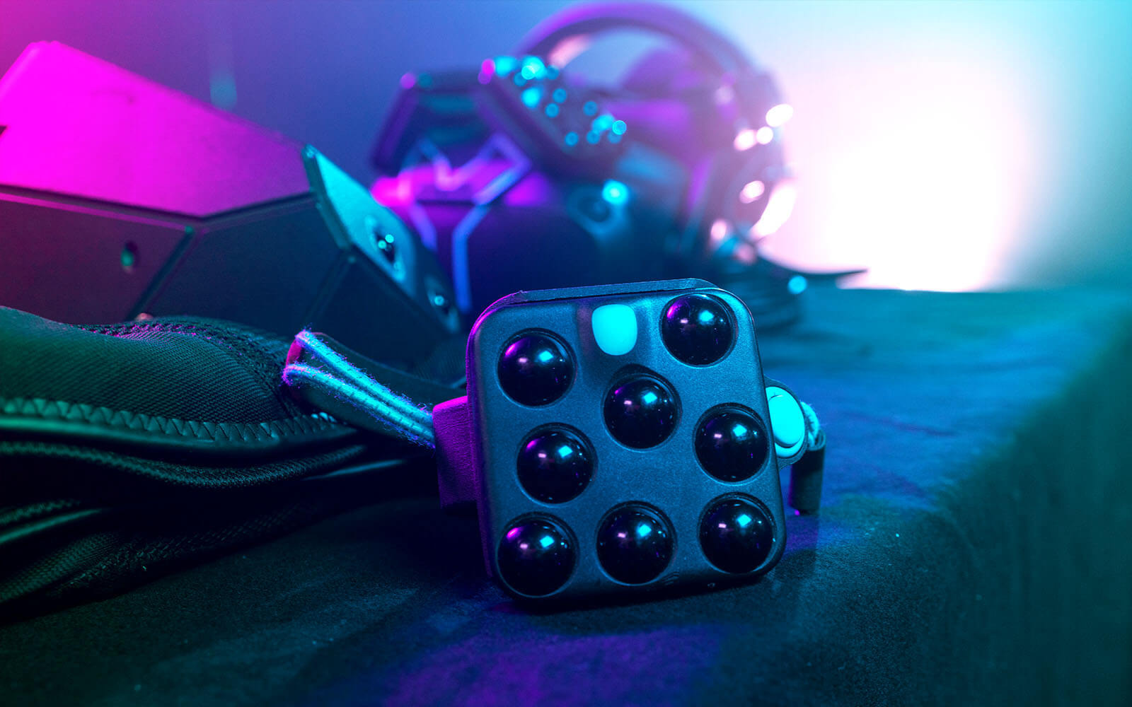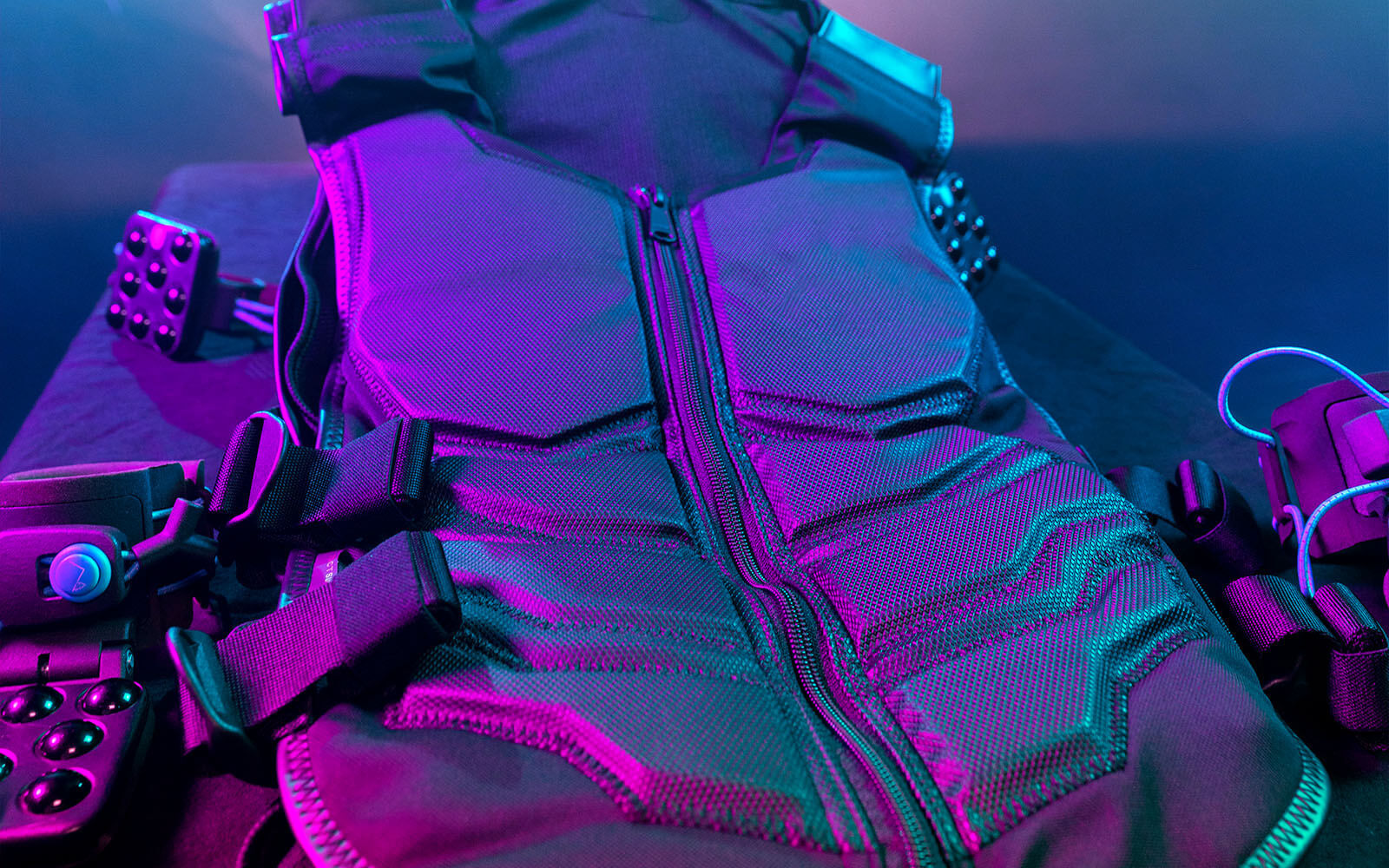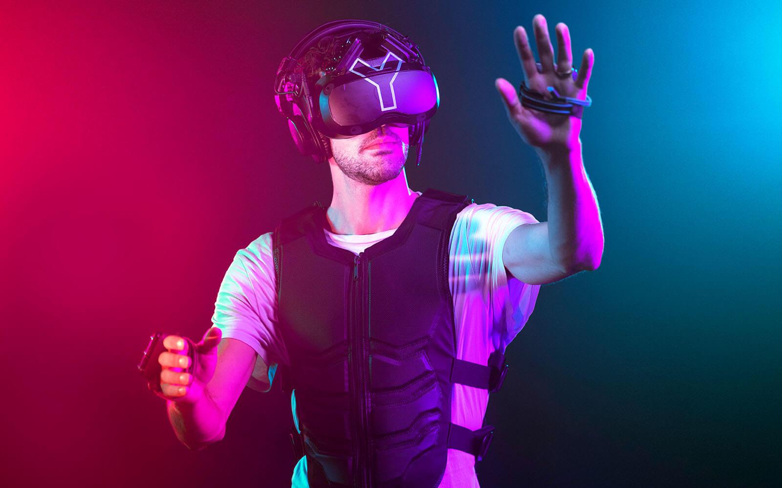 In YULLBE WUNDERLAND PRO you will be equipped with VR goggles, a headset, a vest for haptic vitrations as well as hand and foot sensors. This makes it possible to capture any movements of the players and transmit them to the virtual world for all players to see.